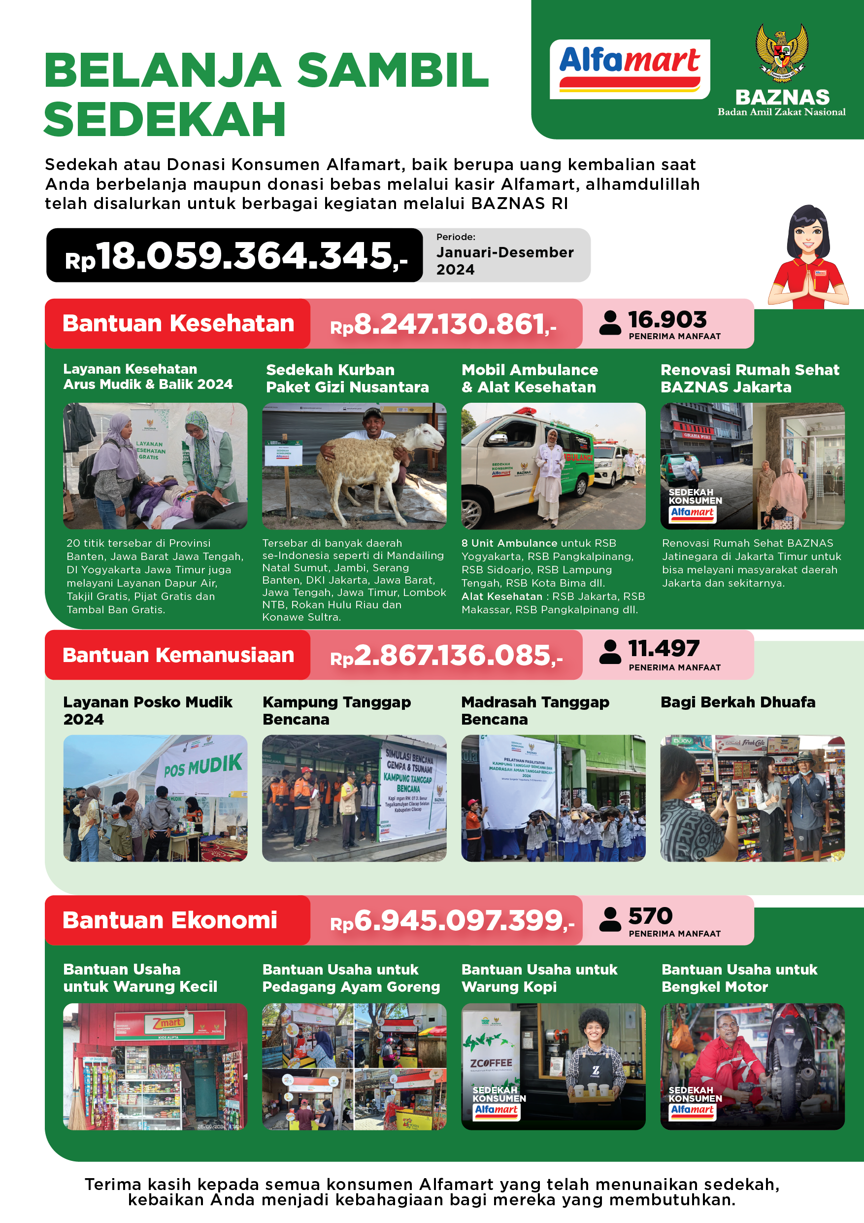 “Kami mengucapkan terima kasih kepada konsumen Alfamart yang secara sukarela memberikan sedekahnya. Sedekah konsumen yang disalurkan di banyak bidang sosial, mulai dari ekonomi dan sosial, kesehatan, hingga kemanusiaan ini diharapkan dapat memberikan banyak manfaat,” terangnya.